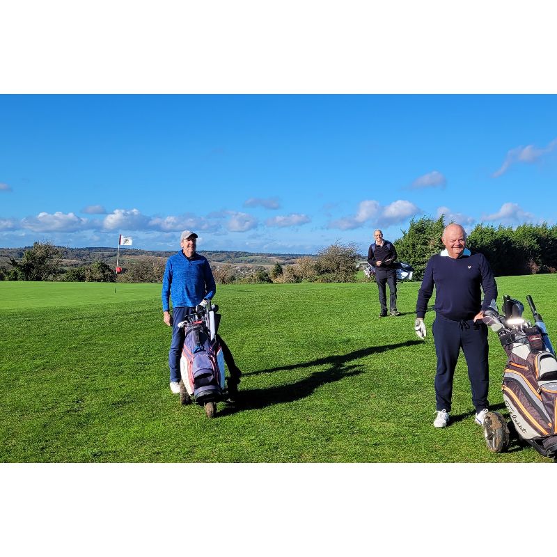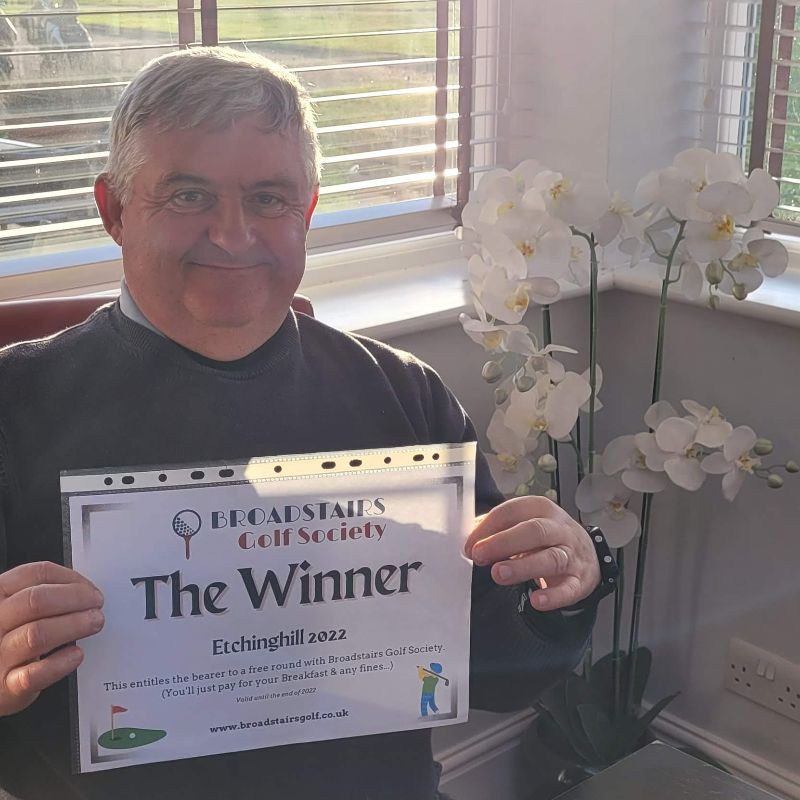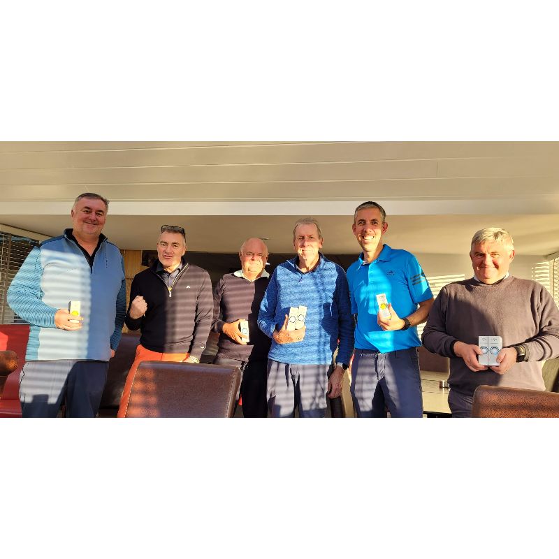 Considering the wet weather over the last couple of weeks, Etchinghill was in pretty good condition, and the sunny but breezy conditions led to some entertaining golf. None more-so than the 215 yard Par3 15th hole where Tony hit a beauty of a Tee shot, shaping it beautifully towards the distant green. Tony's playing partners were waiting to see how close it landed to the pin... when suddenly it dropped from the sky with a splash in the pond 40 yards short of the green. He wasn't the last one to be caught out by this trickiest of Par3s with no-one getting on the green & for the first time in quite a while, one of the Nearest the Pin prizes doesn't have a winner but this did mean there was a unexpected bonus to put a smile on the face of one our merry bunch... but more on that later.