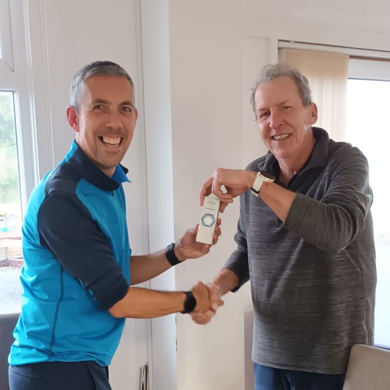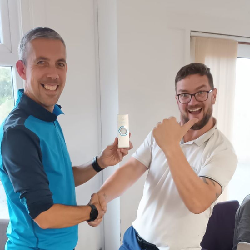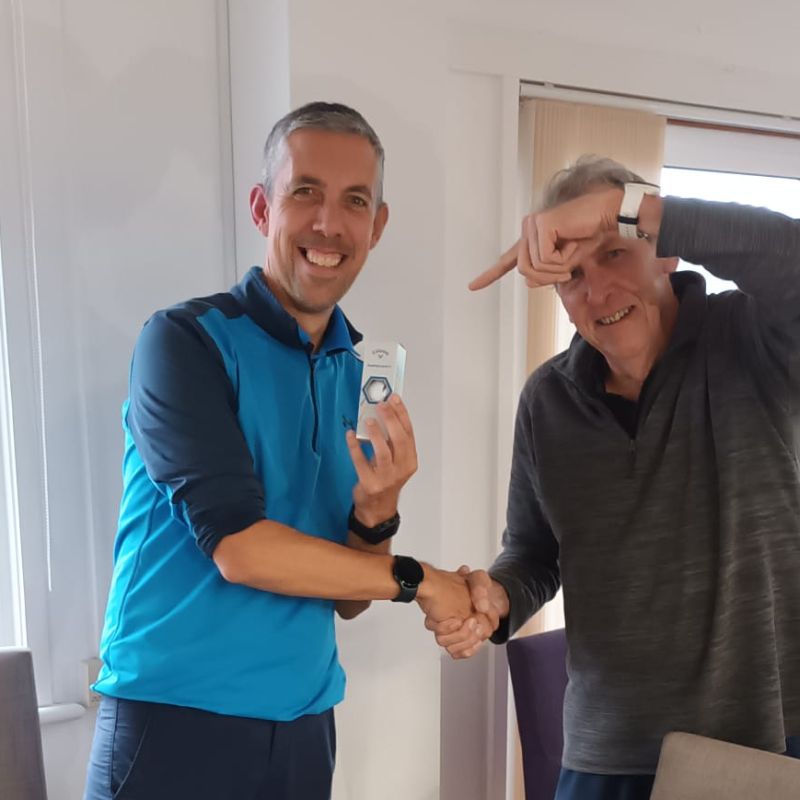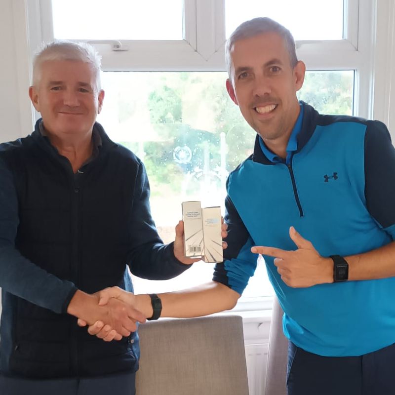 Most Golf went to Laurence, I'm not sure how as he'd scored 13pts off the first four holes... but because no-one won the Nearest-the-Pin on the 17th, we gave Laurence a sleeve of balls to cheer him up as he had the longest drive home out of everyone...