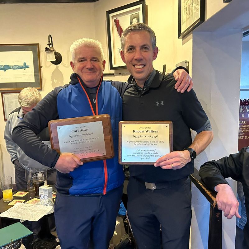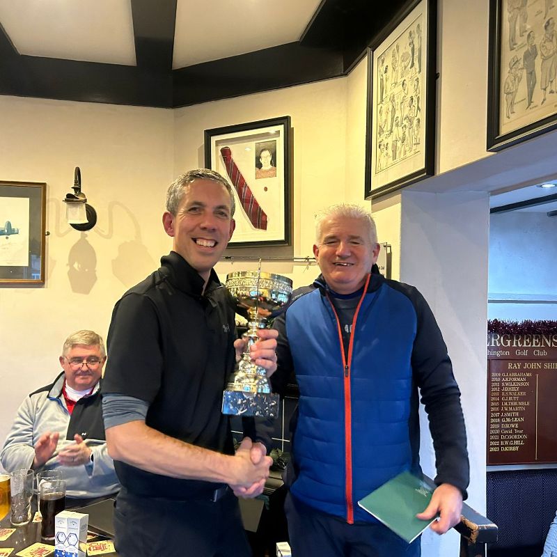 As you can imagine, having 4 of the top 5 BGS golfers of 2024 in the final 4-ball made for an exciting spectacle (not that we had any spectators... & the expected BGS crowd around the 18th green was non-existent as everyone was desperate to get into the comforts of the bar!! - Cheers guys!). To avoid the danger of wallowing in my win & boring the socks off everyone... (Oh the pitfalls of writing these reports... Any volunteers for next year? Please??)... Anyway, after the 15th hole, Pete & Rhod had caught last year's winner & this year's front runner Carl; & the 16th saw them both pull ahead. The 17th couldn't separate them & so the Player of the Year comp made its way down the 216th hole of this year's season... The tricky green-side bunker cost Pete a shot & when yet another putt slowed up seemingly way too quickly, it left Rhod 1 point ahead to win the genuinely gargantuan gleaming glistening golden trophy which was returning to the grateful Welshman after an 8 year gap... (He also received a 4ball voucher kindly donated from Kings Hill).